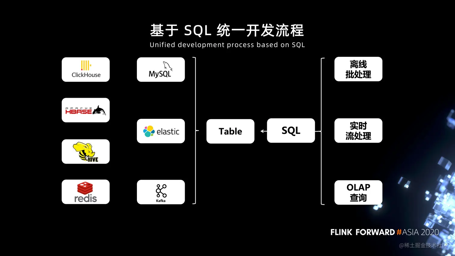 之前提到过我们已经统一了实时和离线的元数据,那么就可以将上图左边的异构数据源和数据存储抽象成统一的 Table ,然后使用 SQL 进行统一的数仓开发,也就是将离线批处理、实时流处理以及 OLAP 查询统一 SQL 化。