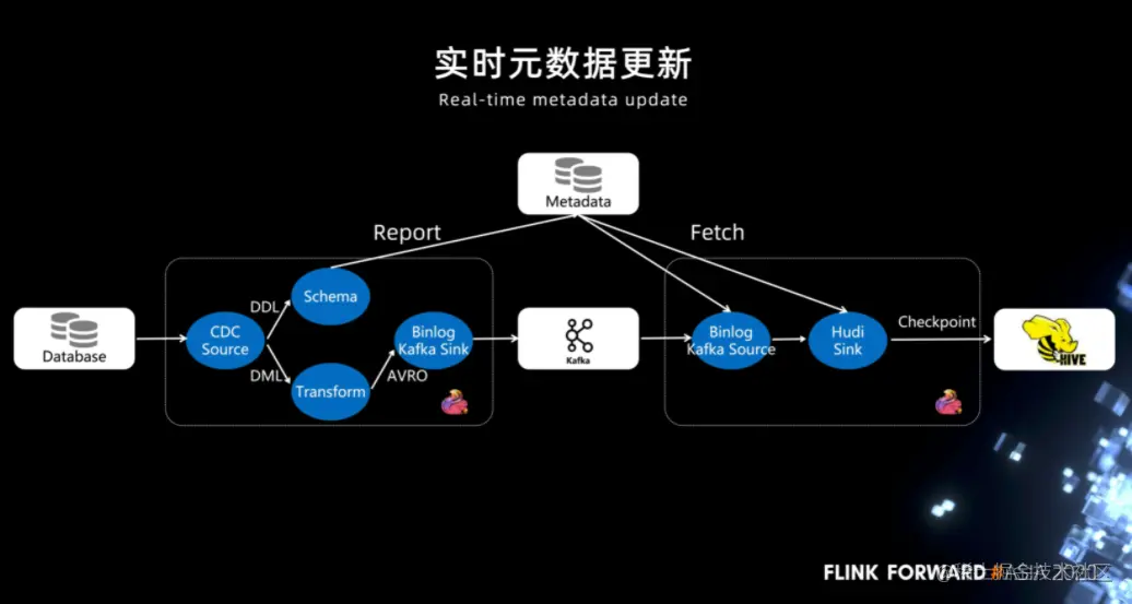 实时元数据更新的过程,还是以 MySQL 为例。CDC Source 会抽取数据库中的 Binlog ,区分 DDL 和 DML 语句分别处理,DDL 语句会上报到元数据中心,DML 语句经过转化变成 avro 格式的 Binlog 数据发送到 Kafka ,如果下游有写入到 Hive 的需求,就消费 Kafka 的数据通过 Hudi Sink 写入到 Hive 。