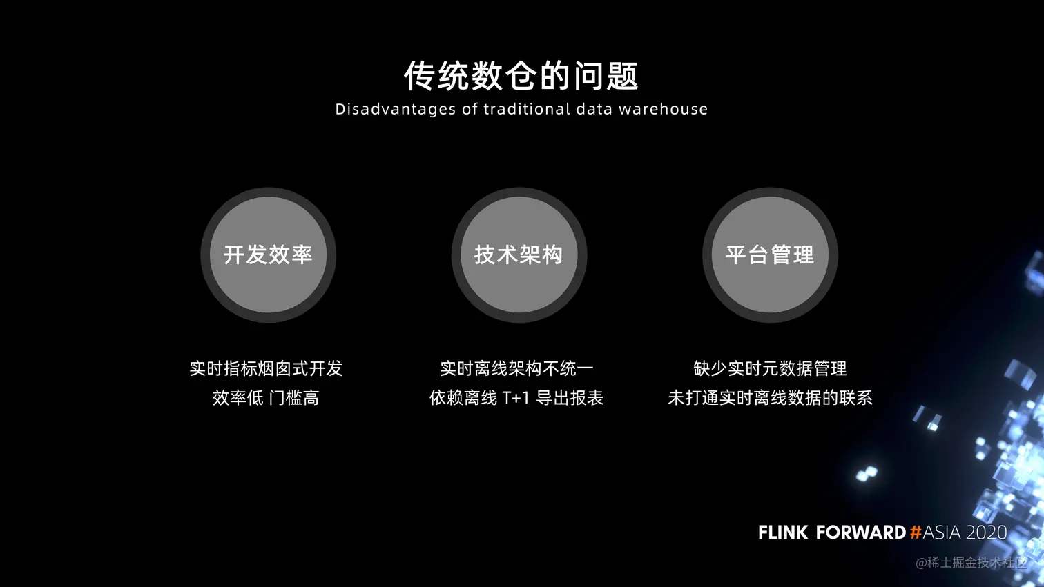 离线和实时两套架构是不统一的,开发方式、运维方式、元数据方面都存在差异。传统架构整体还是以离线为主,实时为辅,依赖离线 T+1 调度导出报表,这些调度任务通常都运行在凌晨,导致凌晨时集群压力激增,可能会导致报表的产出不稳定;如果重要的报表产出有延迟,相应的下游的报表产出也会出现延迟。这种以离线为主的架构无法满足精细化、实时化运营的需要。