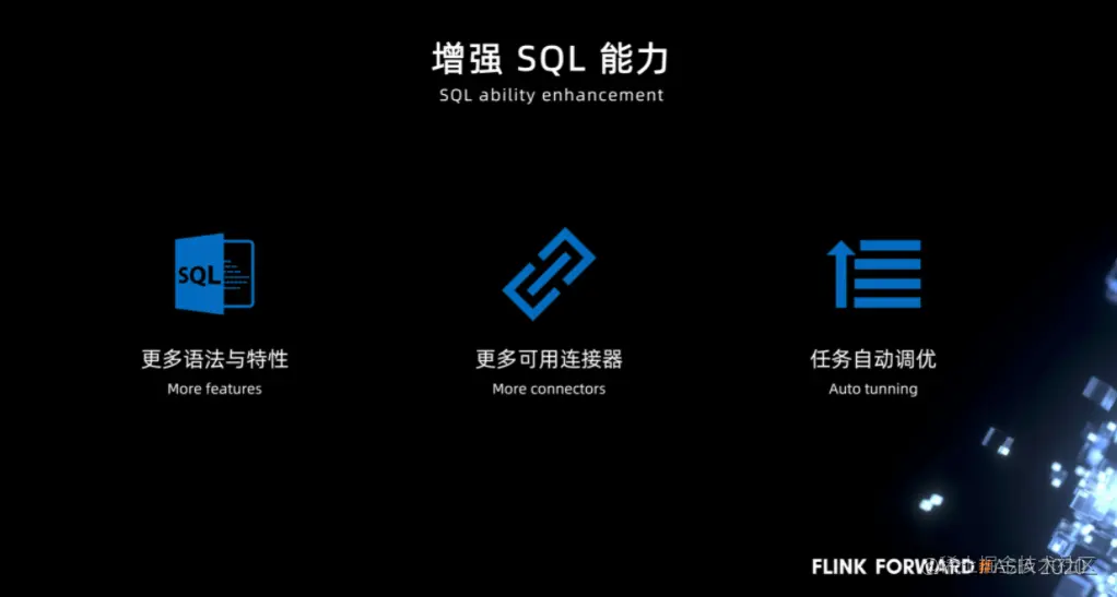 首先,希望能够支持更多 SQL 的语法和特性,支持更多可用的连接器,以及实现 SQL 任务的自动调优等。