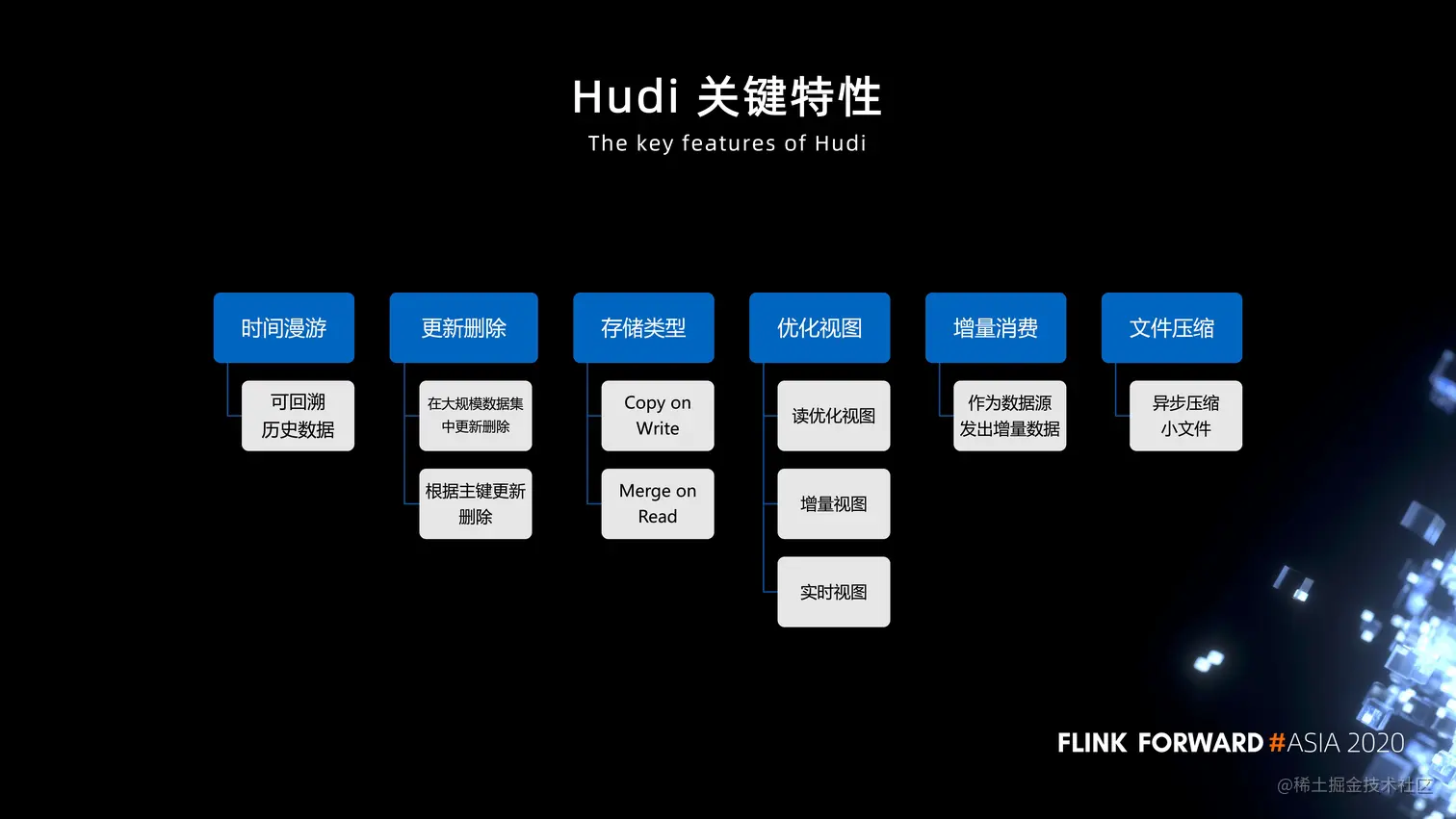 Hudi 的关键特性包括:可回溯历史数据,支持在大规模数据集中根据主键更新删除数据;支持数据增量消费;支持 HDFS 小文件压缩。这些特性恰好能满足我们的需求。