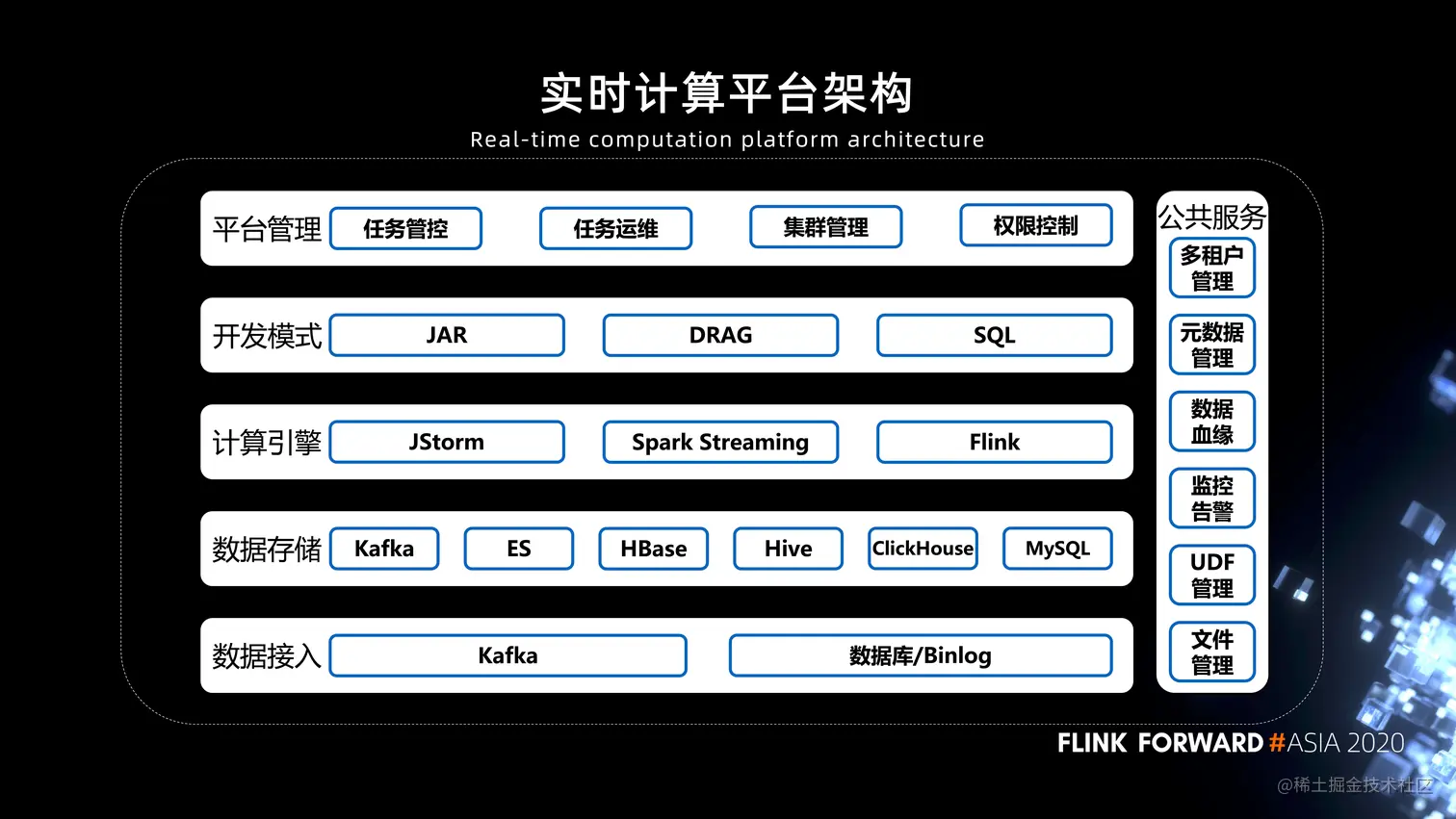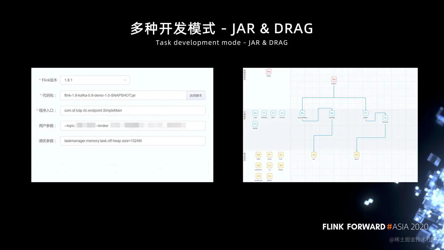 实时计算平台提供了多种开发模式供不同用户选择。以 Flink 为例,Flink JAR 模式由用户编写 Flink 任务代码,打成 jar 包上传到平台,满足高级用户的需求。Flink DRAG 模式则是图形化的拖拽式开发,由平台封装好公共组件之后,用户只需要拖拽公共组件,将其组装成一个 Flink 任务,提交至集群运行。