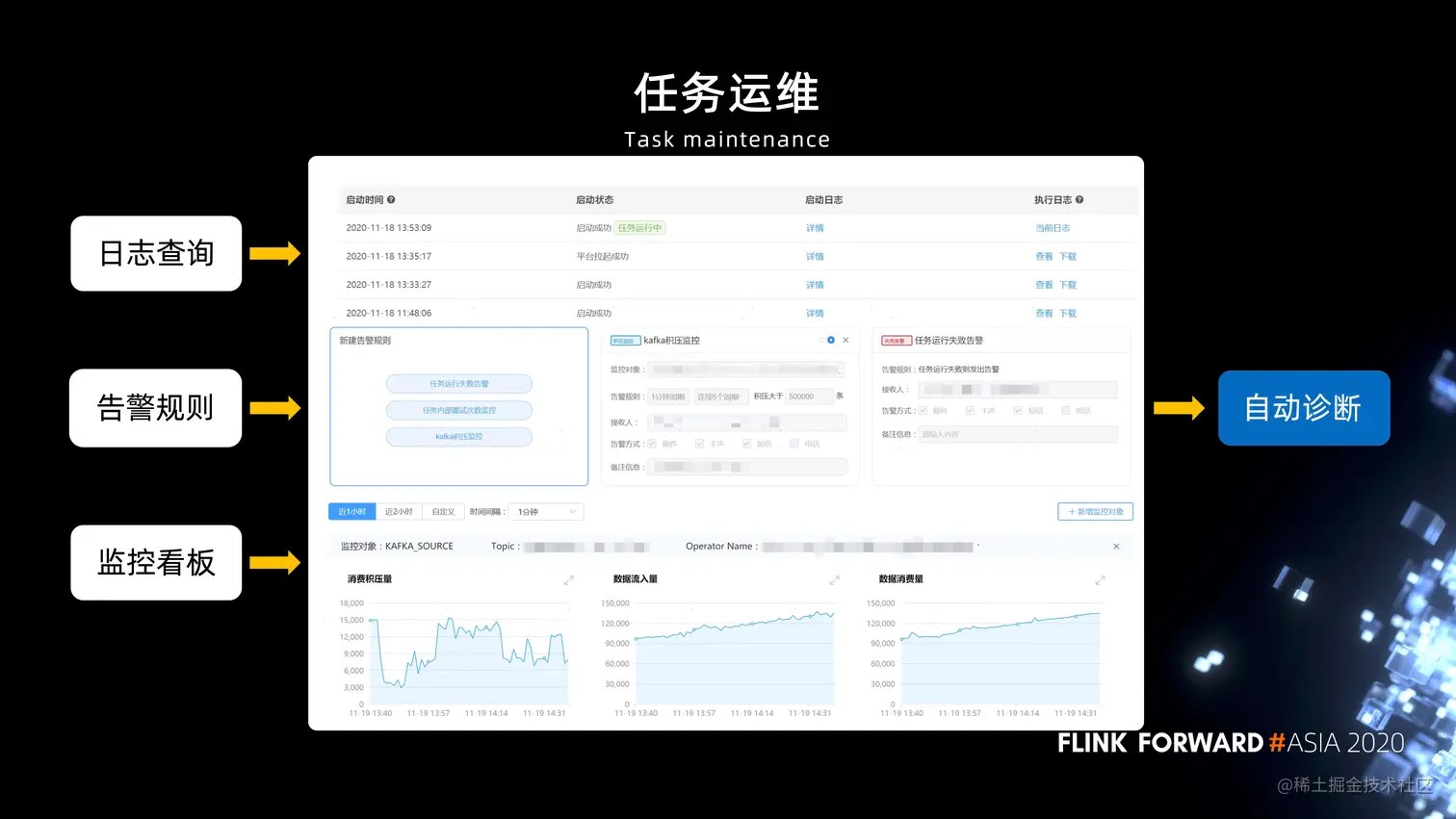 当任务启动之后,平台会自动采集并上报任务的指标,用户可以根据这些指标自定义告警配置,当告警规则被触发时,平台会通过各种方式告警到用户。最后,平台提供了指标的实时监控看板,当然用户也可以自行在 Grafana 中配置监控看板。
