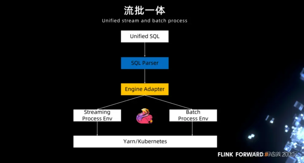 最后,希望能够实现流批一体,通过统一的高度兼容性的 SQL ,经过 SQL 解析以及引擎的适配,通过 Flink 统一的引擎去处理流和批。