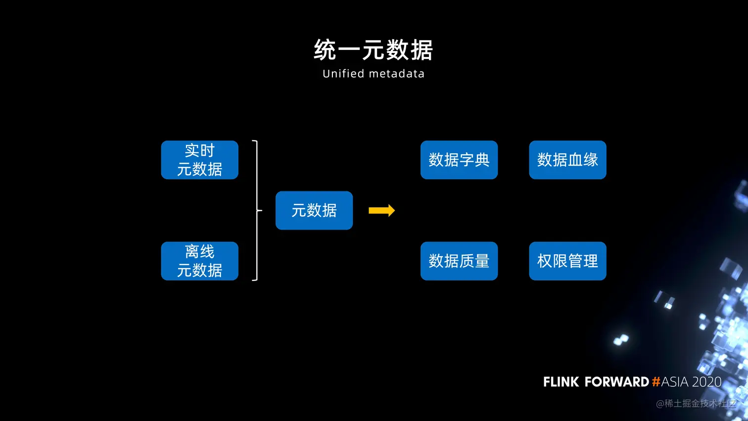 基于以上统一的数仓规范和层级划分模型,可以将实时和离线的元数据进行统一管理。下游的数据治理过程,比如数据字典、数据血缘、数据质量、权限管理等都可以达到统一。这种统一可以沉淀实时数仓的建设成果,使数仓能更好的落地实施。