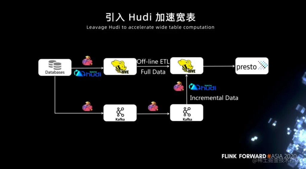 另外,使用 Flink 消费 Kafka 中接入的数据,进行清洗聚合,通过 Hudi 增量更新 DWD 层的 Hive 宽表,将宽表从离线加速成准实时。