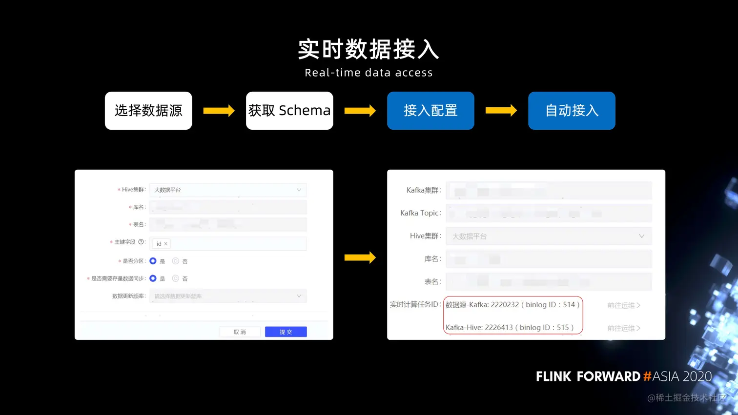 随后,用户选择有权限的集群,设置 Hive 表的主键 ID 和分区字段,提交申请之后,平台就会自动生成 Flink 任务,抽取数据到 Kafka 并自动落入 Hive 表中。对数据库类型的数据源,还支持分库分表功能,将分库分表的业务数据写入 ODS 层的同一张表。另外也支持采集主从同步的数据库,从从库中查询存量数据,主库拉取 Binlog,在减轻主库压力的同时降低数据同步延迟。