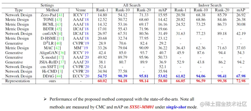 我们把跨模态行人群识别的相关工作大体分为了 4 类:Network Design(网络框架设计)、Metric Design(度量设计)、Generative(生成类)、Representation(表征学习类)。