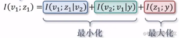 如果要想提升表征对于视图变化的鲁棒性,以及进而提升任务的精度,只需要保持 I(z1;y)(红色部分)就可以了,I(v1;z1|v2)(蓝色部分)和 I(v2;v1|y)(绿色部分)都要丢掉。优化的目标如下: