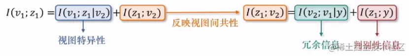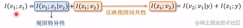 如上图所示,此项互信息是同一视图下的观察量和其表征之间的互信息。但拆分的时候要注意和 VSD 中的处理的区别,因为这里对信息的划分依据是它是否反映了视图间的共性,而不再是判别性和冗余性的要求,所以它拆分出来的结果有 I(Z1;V2) = i(v2;v1|y) + I(z1;y)。