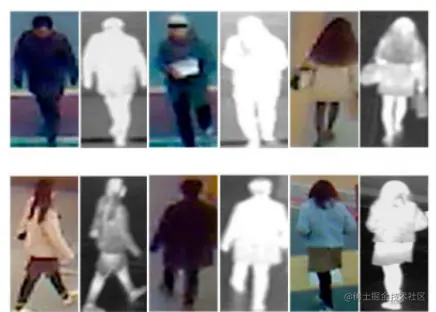 跨模态行人群识别问题,是计算机学的子问题,核心目标是为给定的人像匹配另一个模态下的照片。举例来说,以下图绿色框标记出来的红外图像来说,我们希望在一个图像库中找到对应同一个人的可见光图像,要么是用红外光去找可见光,或者用可见光去找红外光。