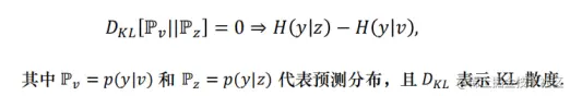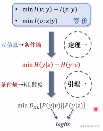 定理一:最小化 I(v;y) − I(z;y) 等价于最小化 v,z 关于任务目标 y 条件熵的差值,即: