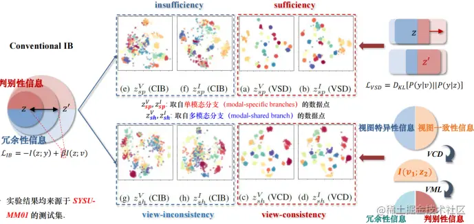 我们先针对充分性展开分析,就是 VSD 和传统信息瓶颈的对比。上标“V”“I”代表的是可见光和红外光下的数据,而下标的 Sp 代表的是 View specific,也就是说他们取自于单模态的分析。
