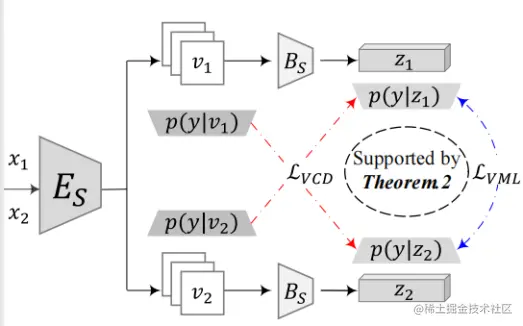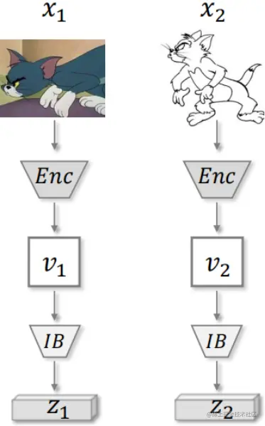如上图,这是一个最基本的框架。两张图像 x1,x2,输入到一个编码器中,得到两个原始的高维特征图 v1 和 v2,然后把 v1 和 v2 送到信息瓶颈,得到两个压缩过的低维度表征 z1 和 z2。