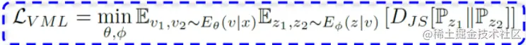 变分互学习(Variational Mutual Learning, VML,对应上图蓝色部分):最小化 z1, z2 预测分布之间的 JS 散度以消除其所包含的视图特异性信息,具体目标如下: