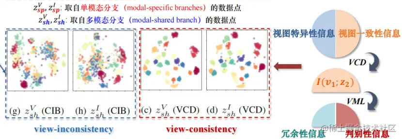 之后再根据视图是否满足判别性要求,对层次的视图间共性的信息进行二次划分,得到两项冗余信息和判别信息(如上图)。