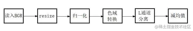 如算法设计部分所言,该模型采用Lab色彩空间,因此需要把BGR格式转为Lab格式数据。该模型用L通道数据预测出可能的ab空间数据,所以要从Lab数据中分离出L通道数据。再对所得的数据减均值,即可得到模型需要的输入数据。