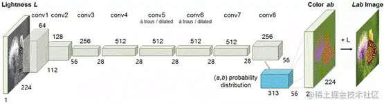 对物件(包括背景色)(L通道代表的灰度图)使用卷积运算提取特征,然后同样用卷积进行分类,从而尝试给出对灰度图片每个像素点的色彩预期(ab通道)。然后,将ab通道的值resize到原始图片宽高并与L通道叠加后,转为RGB图片即可得到彩色图像。其中模型的输入为L通道的数据(224,224,1),输出为ab通道的数据(56,56,2)。