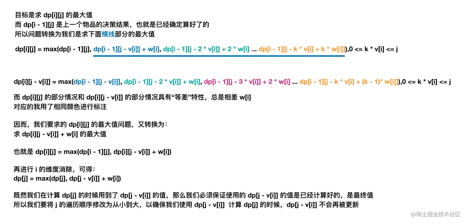接下来,我们从「数学」的角度去证明为什么修改 01 背包的遍历顺序可以正确求解完全背包问题。