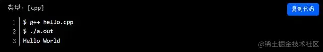 键入'g++hello.cpp',输入回车,编译代码。如果代码中没有错误,命令提示符会跳到下一行,并生成a.out可执行文件。