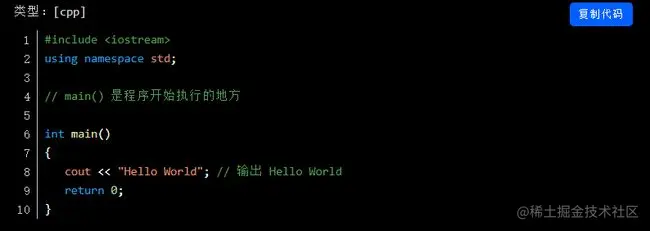 下一行//main()是程序开始执行的地方是一个单行注释。单行注释以//开头,在行末结束。