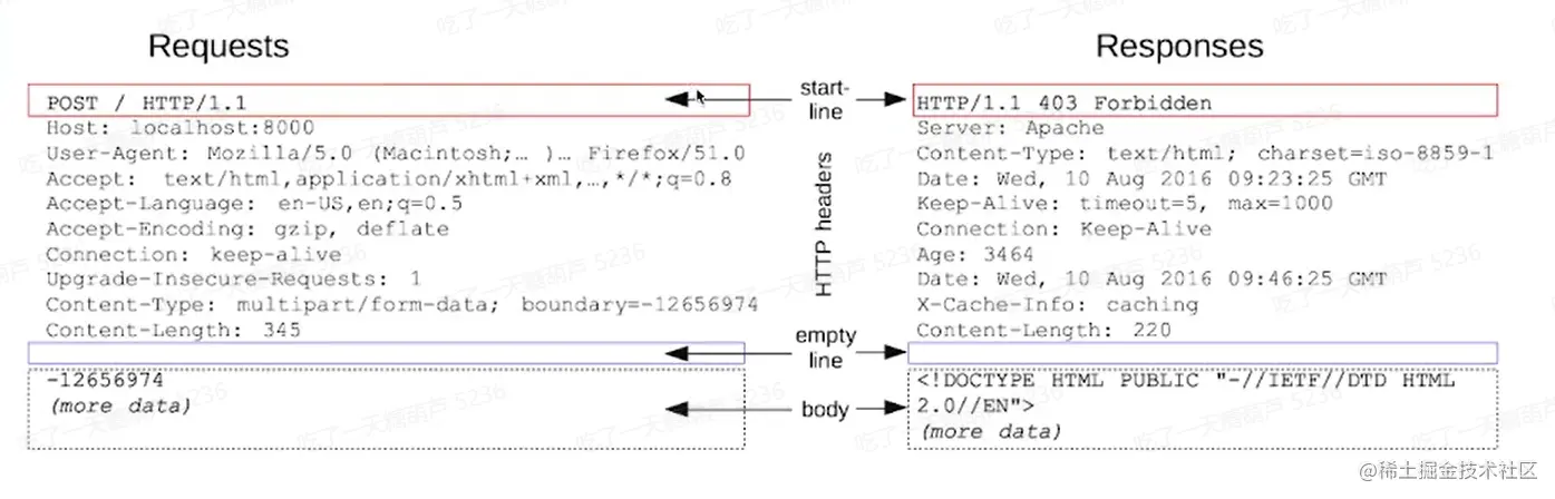 - 起始行(请求/响应行):Request:Method Path Version | Responses: Version StatusCode StatusMessage
