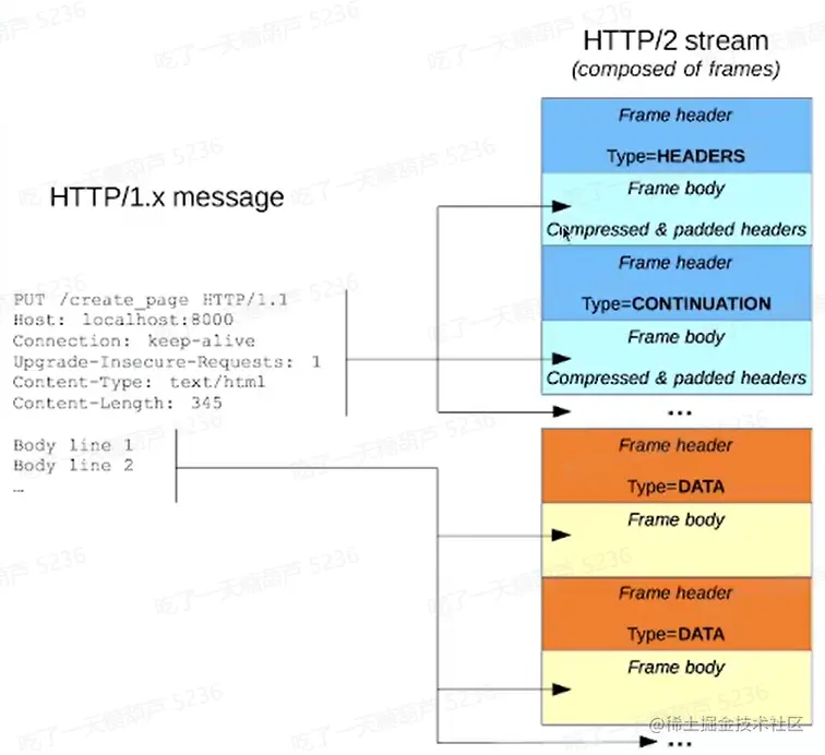- 帧:HTTP/2通信的最小单位,每个帧都包含帧头,至少也会标识出当前帧所属的数据流。