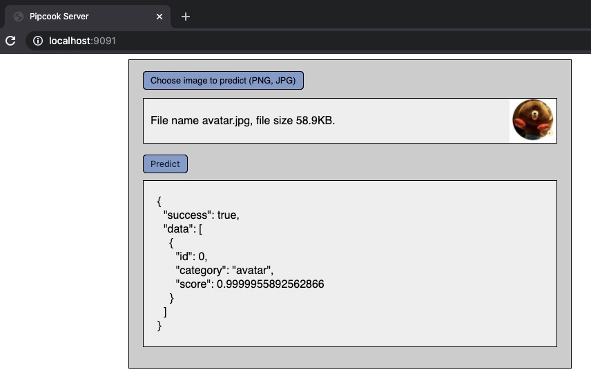 $ curl http://localhost:9091/predict -F "image=@/Users/pipcook-playground/avatar.jpg" -v