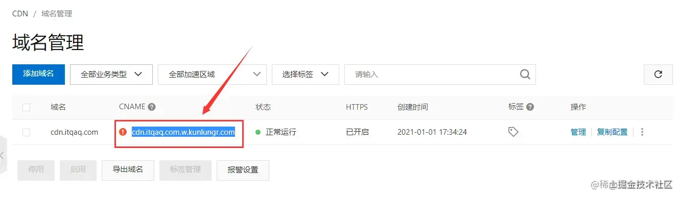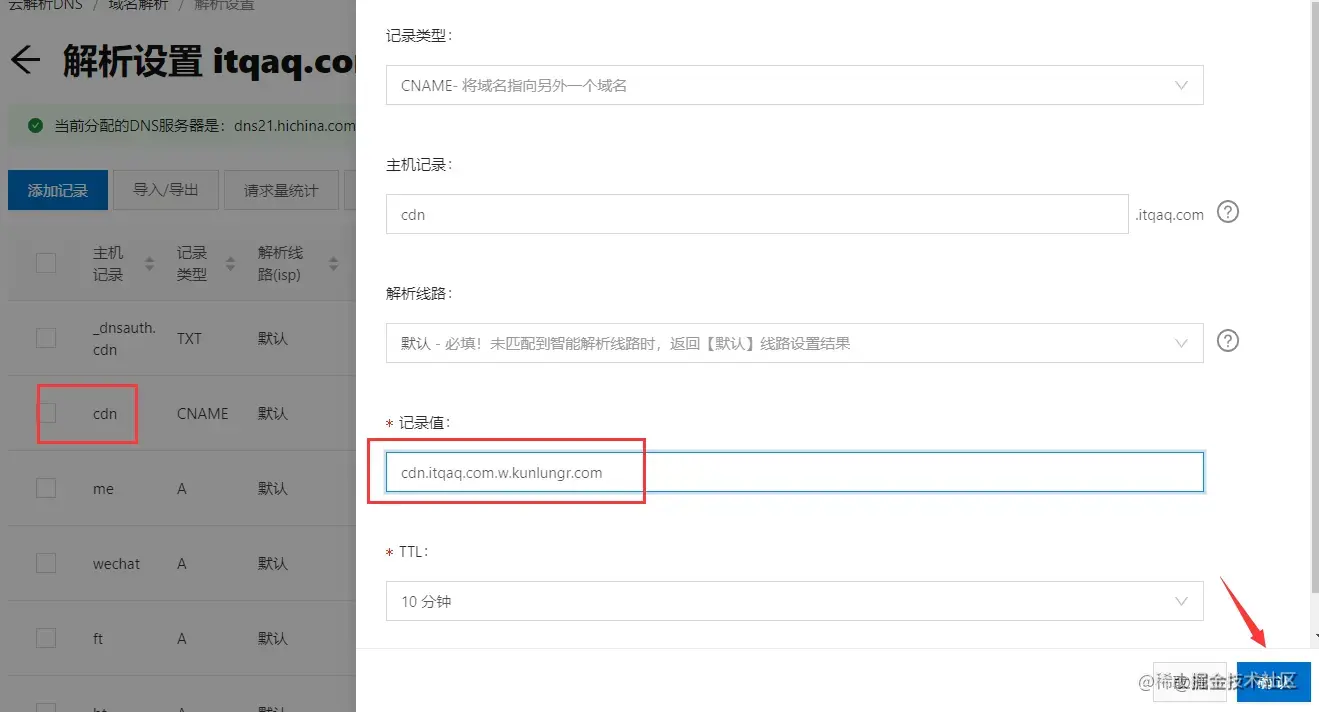 修改解析的CDN域名的CNAME记录值,将刚才复制的CNAME粘贴上去
