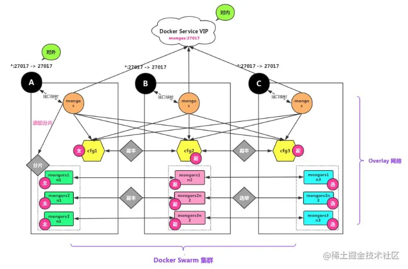 内部:在 mongo 网络下的容器,通过 mongos:27017 连接