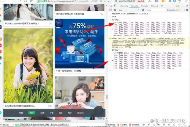 我们可以看到,通过这个语法糖可以打印当前页面所有的图片信息,显示70,说明这个页面有70张图片,当小编再次滚动鼠标时发现图片数量就变多了,变成了136张图片,这说明它是Ajax加载的。