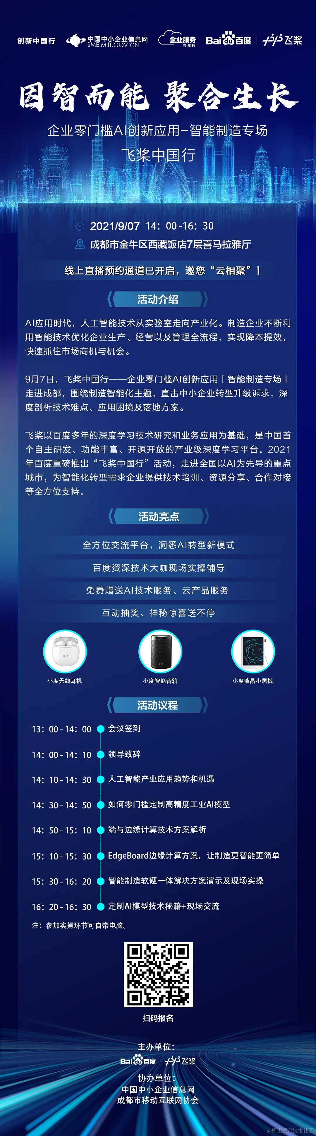 为进一步促进智能制造行业高质量发展 ,9月7日飞桨中国行-零门槛 AI 创新应用智能制造专场将落地成都,届时将有众多百度技术专家与行业专家围绕制造智能化主题,直击中小企业转型升级诉求,深度剖析技术难点、应用困境及落地方案,现场实操环节还会手把手指导如何快速部署模型到边端硬件并验证效果,如需提前了解课程相关内容,请前往百度AI开发平台:ai.baidu.com进行查看。