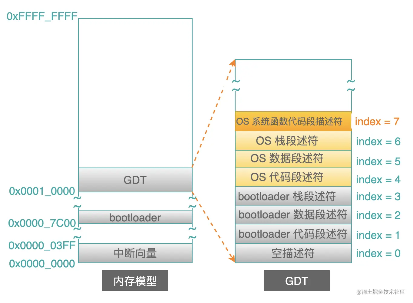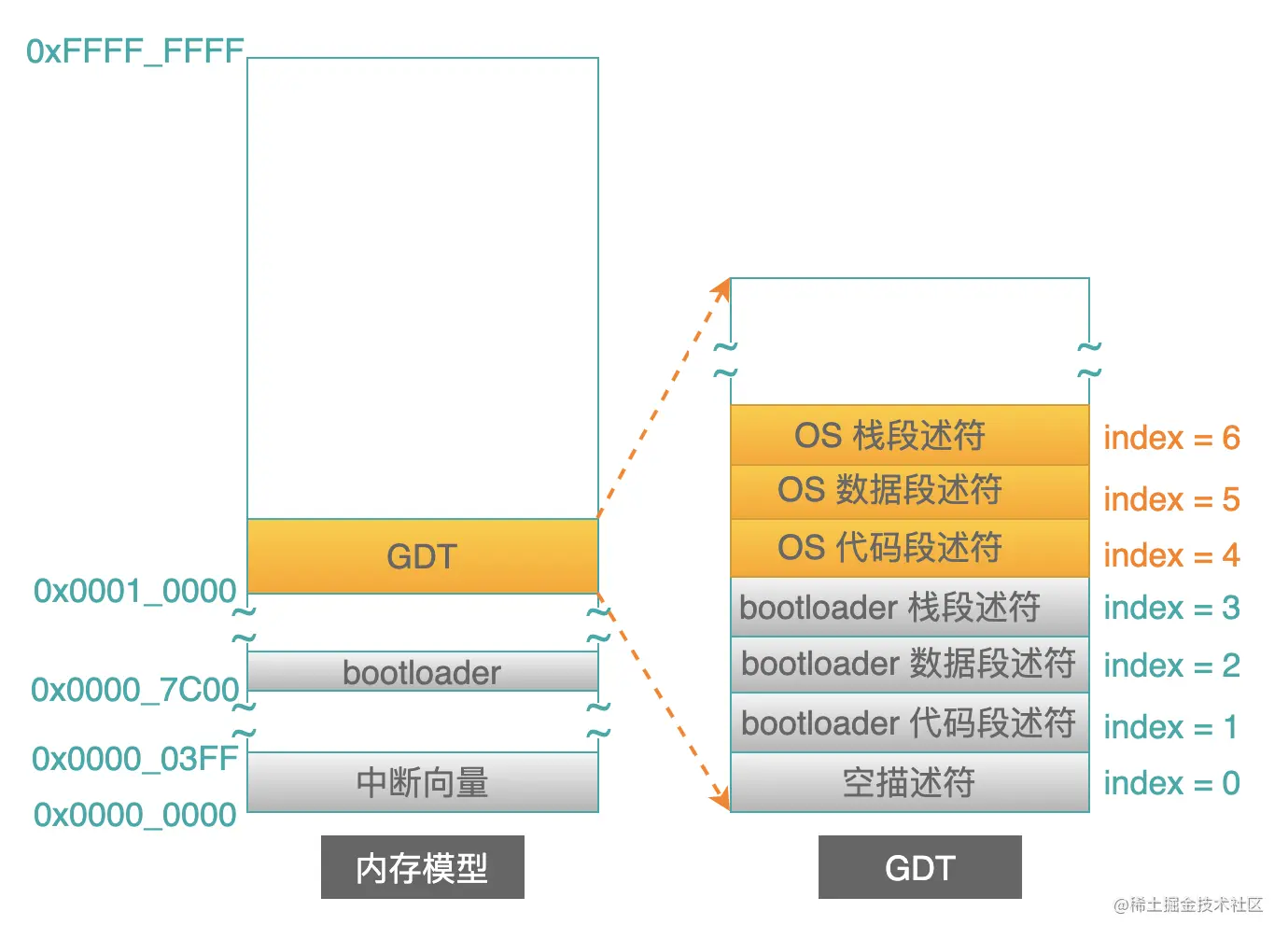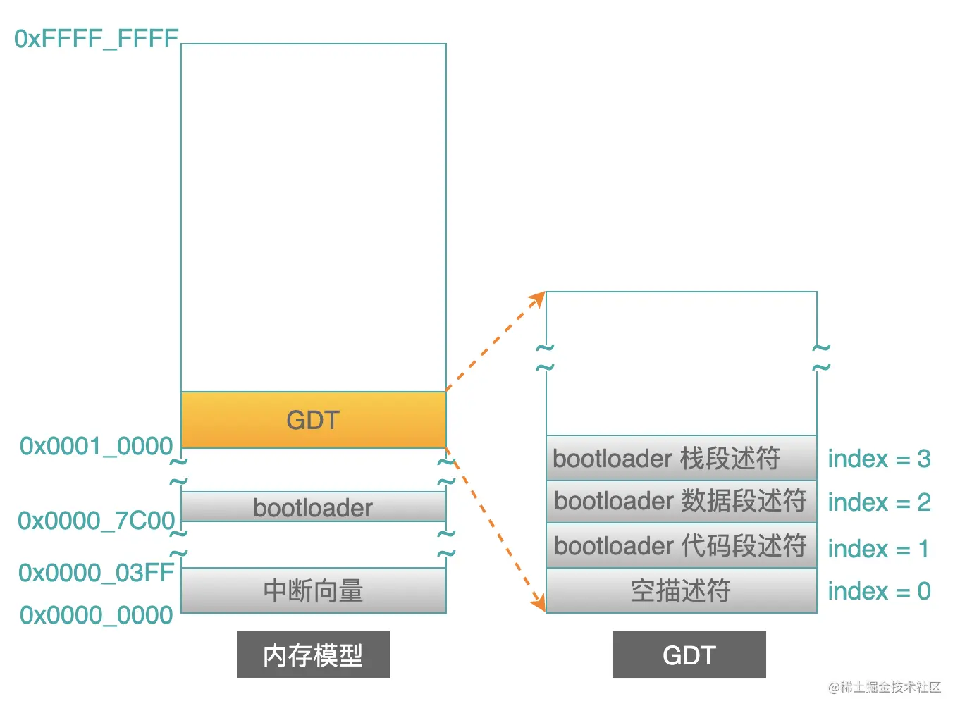 在上一篇文章中,讨论了 bootloader 在进入保护模式之后,在地址 0x0001_0000 处创建了全局描述符表(GDT),表中创建了 3 个段描述符: