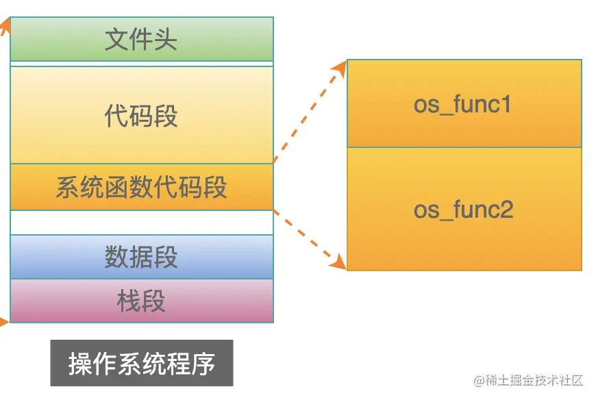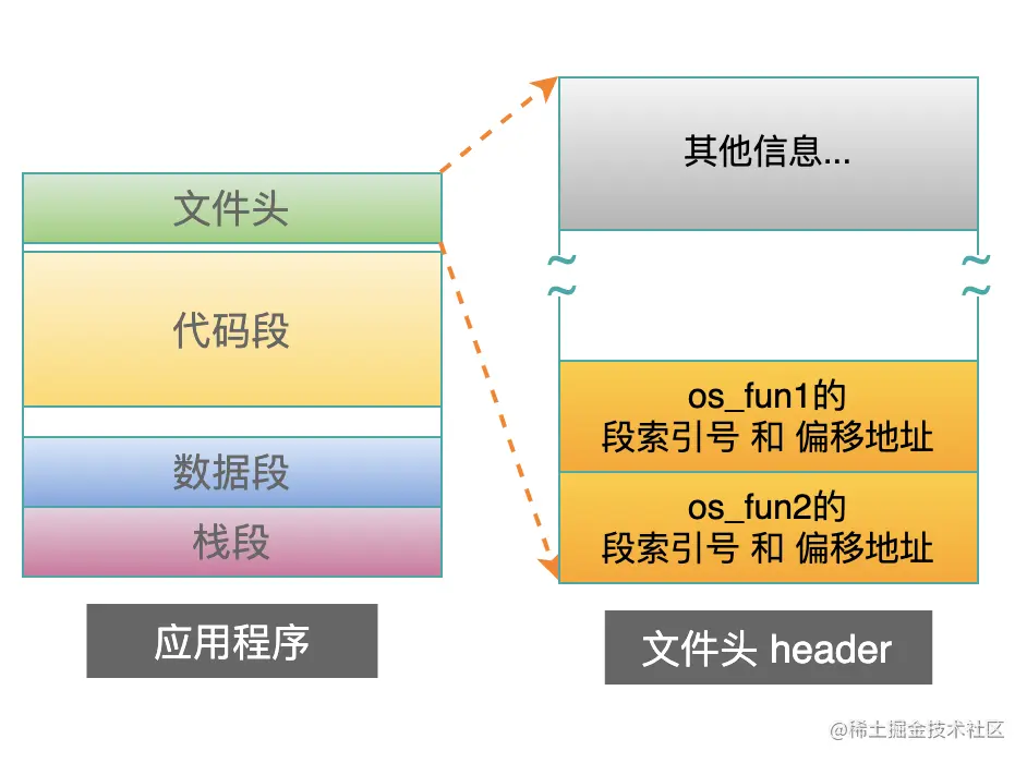 应用程序有了这个信息之后,当需要调用 os_func1 时,就直接跳转到相应的 段索引号:函数偏移地址,就可以调用到这个系统函数了。