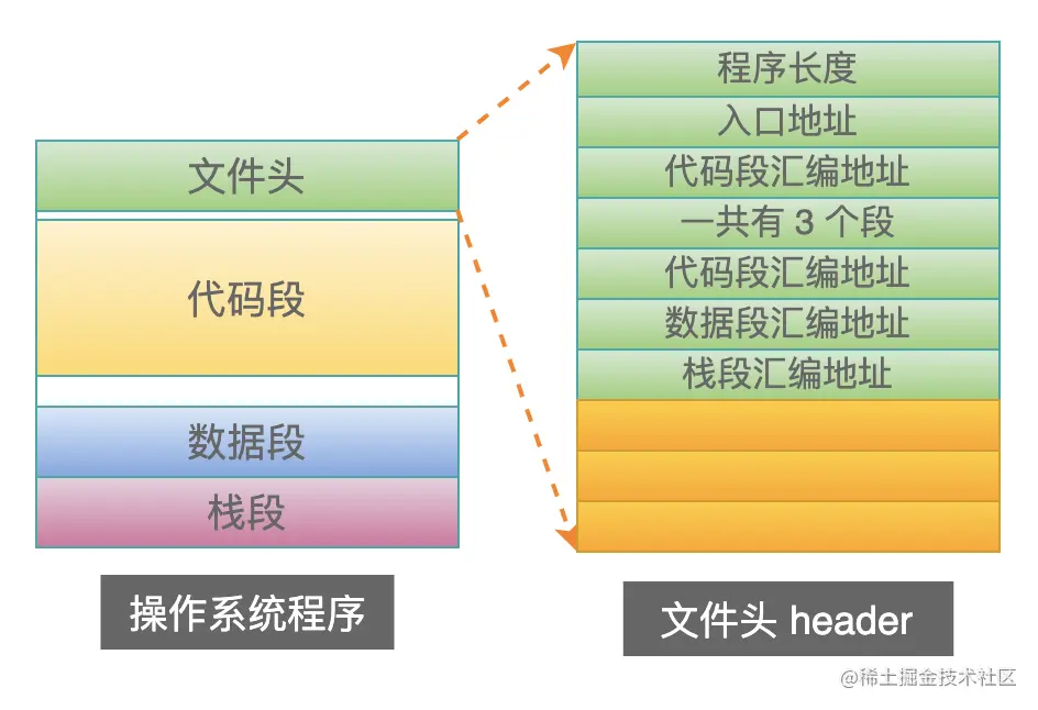 bootloader 在把操作系统,从硬盘加载到内存中之后,从 header 中取得 3 个段的汇编地址(即:段的开始地址相对于文件开始的偏移量),然后计算得到段的基地址,最后把段基地址写回到 header 的这 3 个段地址空间中。