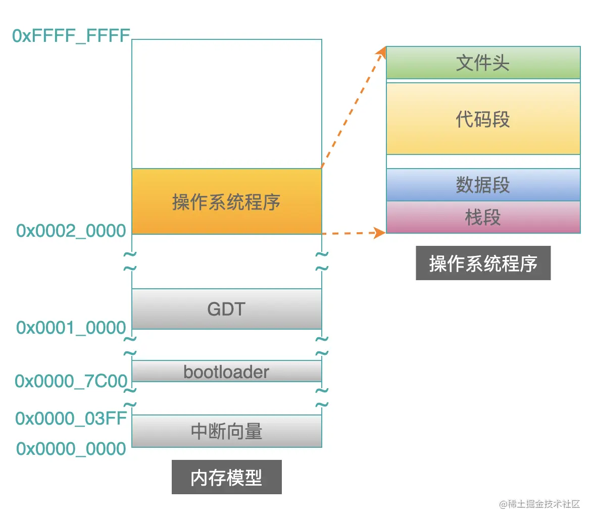 bootloader 把 OS 加载到内存中之后,会解析 OS 的 header 中数据,得到每个段的基地址以及界限。