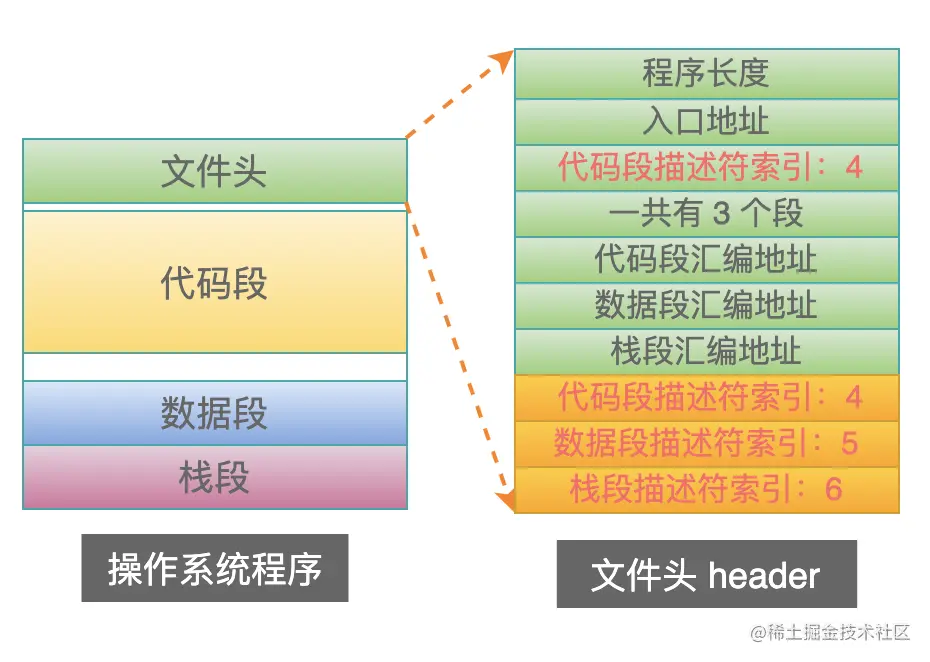 操作系统为应用程序创建每一个段描述符,并且把索引号写回到 header 中;