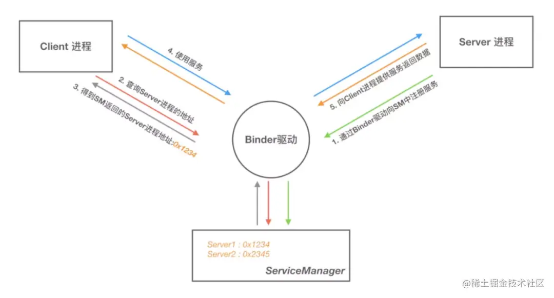 - Client 通过名字,在 Binder 驱动的帮助下从 ServiceManager 中获取到对 Binder 实体的引用,通过这个引用就能实现和 Server 进程的通信。