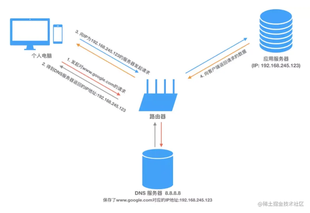 通常我们访问一个网页的步骤是这样的:首先在浏览器输入一个地址,如 www.google.com 然后按下回车键。但是并没有办法通过域名地址直接找到我们要访问的服务器,因此需要首先访问 DNS 域名服务器,域名服务器中保存了 www.google.com 对应的 ip 地址 10.249.23.13,然后通过这个 ip 地址才能放到到 www.google.com 对应的服务器。