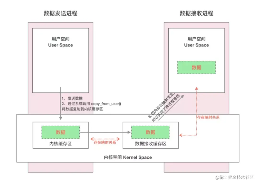 - 发送方进程通过系统调用 copy_from_user() 将数据 copy 到内核中的内核缓存区,由于内核缓存区和接收进程的用户空间存在内存映射,因此也就相当于把数据发送到了接收进程的用户空间,这样便完成了一次进程间的通信。