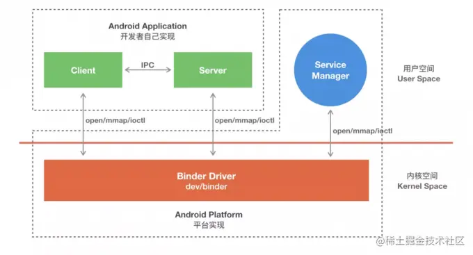 包括 Client、Server、ServiceManager、Binder 驱动。其中 Client、Server、Service Manager 运行在用户空间,Binder 驱动运行在内核空间。其中 Service Manager 和 Binder 驱动由系统提供,而 Client、Server 由应用程序来实现。Client、Server 和 ServiceManager 均是通过系统调用 open、mmap 和 ioctl 来访问设备文件 /dev/binder,从而实现与 Binder 驱动的交互来间接的实现跨进程通信。