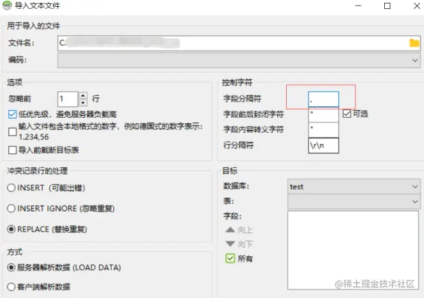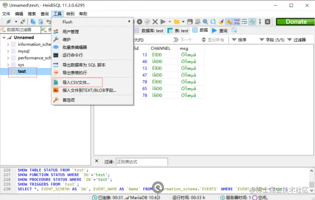 4、进入mysql首先创建一个表,然后选中该表。使用工具中“导入csv文件”,注意字段分隔符改为“,”,在目标 -> 表 ->新建表;随后一直点击确定就行了。Excel表已经成功导入进去,注意先刷新再查看。