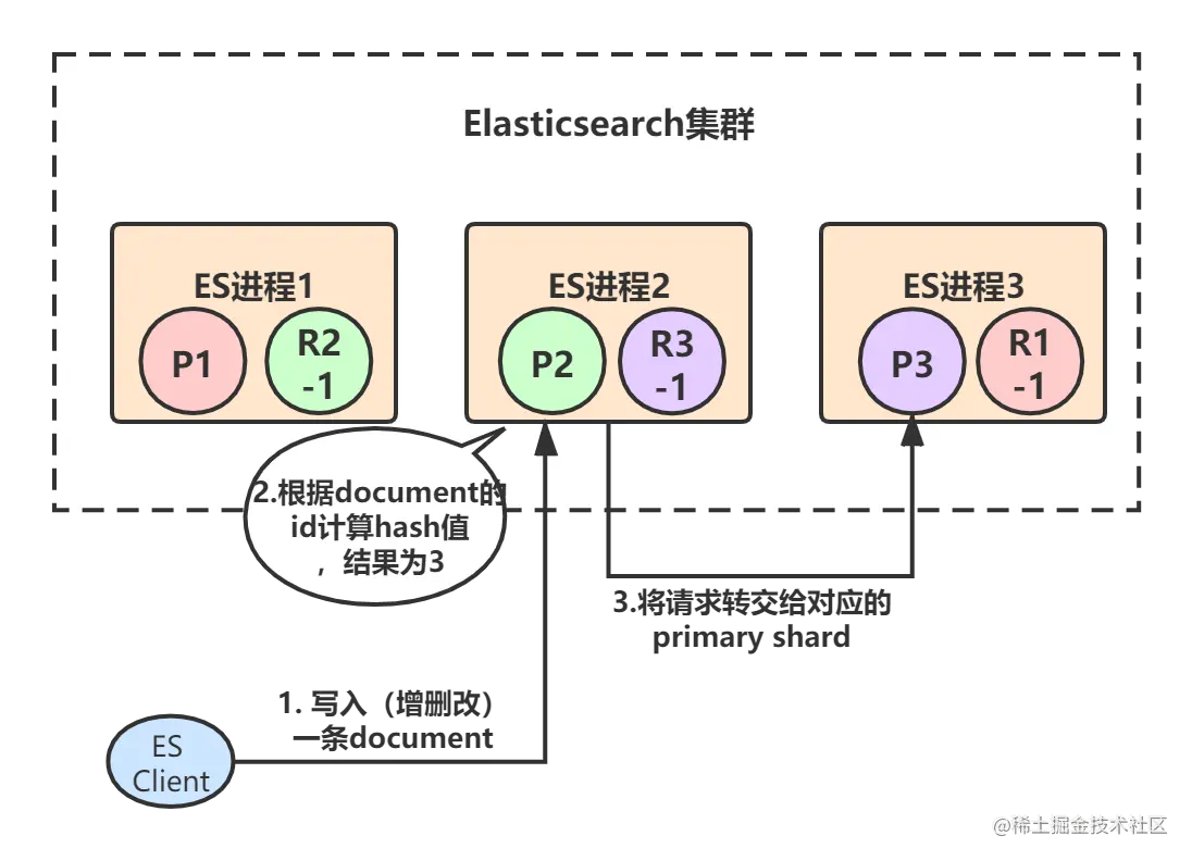 - 假设ES进程2节点(协调节点)接受到了请求,于是根据document的id进行hash计算,发现结果是3,也就是应该由P3这个primary shard处理这个请求,所以就会把请求转发给ES进程3节点上的P3。