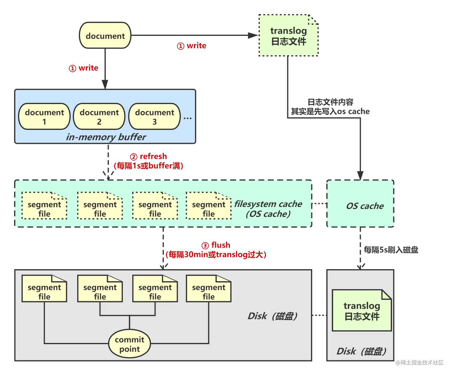 一条document数据被写入磁盘会经历以下几个过程。write、refresh、flush、merge。