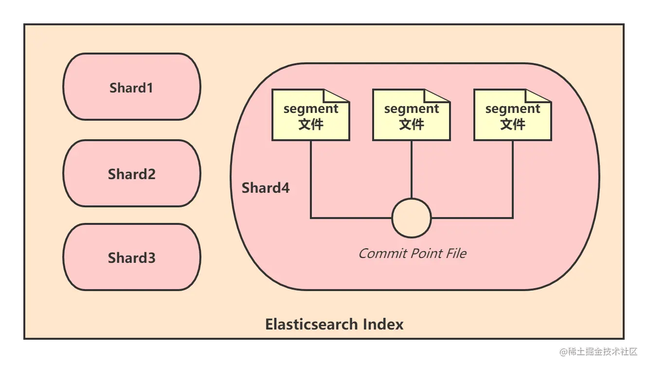 在Elasticsearch中创建一个index索引时,需要指定shard分片,一个shard分片在底层其实是一个Lucene索引,它由若干个segment文件和对应的commit point(提交点文件)构成。