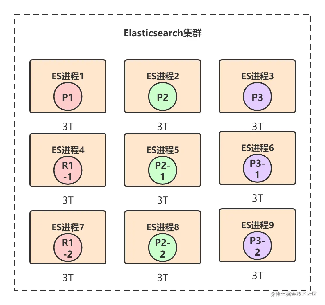 3节点集群创建索引,共有3个primary shard,每个primary shard都有2个replica shard,那总共就是9个shard: