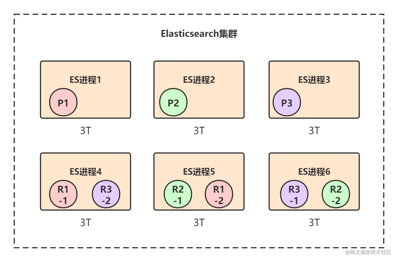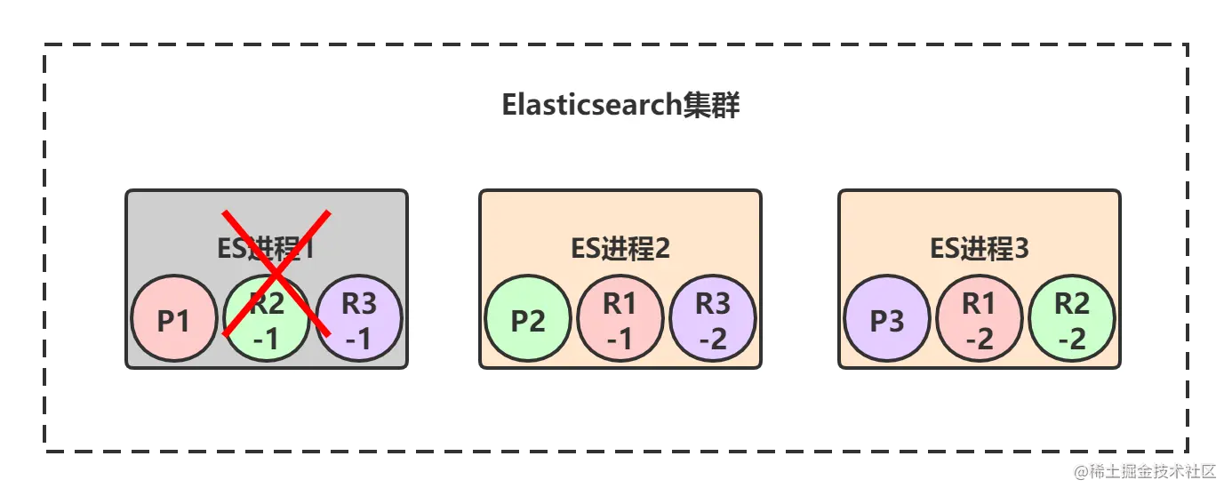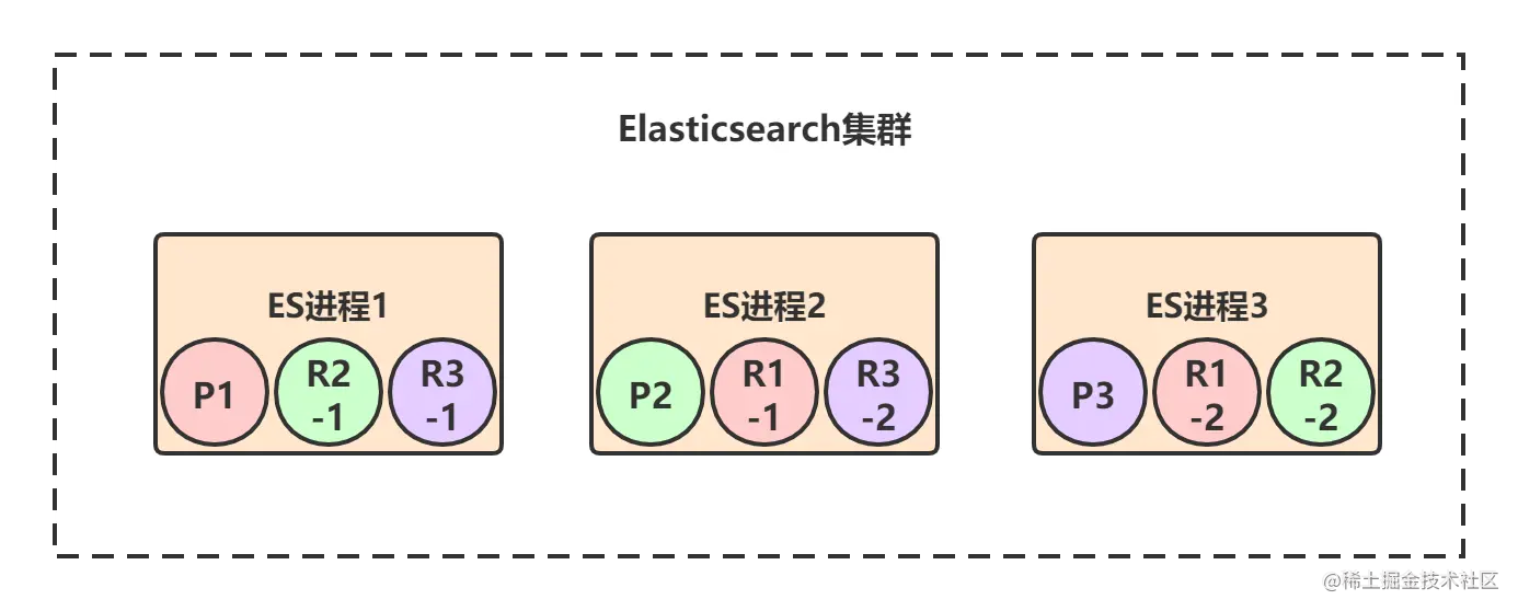 - R?-?:每个primary shard都有一个replica shard,replica shard其实就是个数据备份,类似于msater/slave模式中的slave节点。6个replica shard也会被负载均衡到各个ES进程节点上。