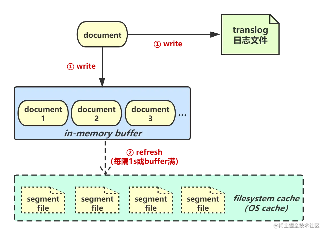 每隔1秒Elasticsearch会执行一次refresh操作,将buffer中的数据refresh到filesystem cache中的一个新segment file中。filesystem cache等价os cache。注意:此时的segment file仅仅是存在于os cache中的缓存数据,并不存在于磁盘上。