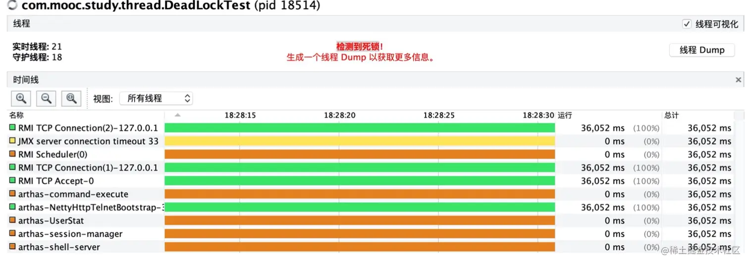 通过 Jvisualvm 命令打开软件,选中进程,进入线程视图,会给出死锁提示:
