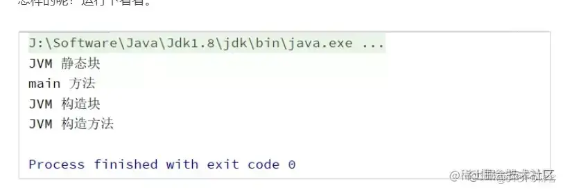 可以看到,首先打印了在 JVM 静态代码块,并没有去执行构造派以及构造方法的代码。这个很好理解,因为我们没有去 new SumDemo。然后当代码执行到 main 方法的时候,去 new Sub 对象,new 之前它去执行这里的 的方法,于是它就去执行 Sub 类中的代码。
